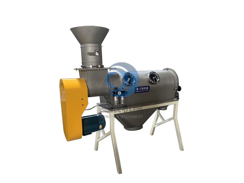 篩機由電機、機座、篩箱、進出料推進裝置等組成。物料由料斗經(jīng)螺旋輸送進入篩箱,分流葉片連續(xù)轉(zhuǎn)動,形成了物料在篩箱內(nèi)不斷的更新推進,使物料產(chǎn)生運動沖向篩網(wǎng),細料通過篩網(wǎng)落入成品倉,粗料繼續(xù)向前推進,在粗料口排出,從而達到理想的篩分效果。